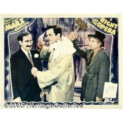 <B>A Night at the Opera (MGM, 1935)</B></I> Lobby Card (11" X 14"). Groucho and Harpo Marx are at it again in this great card. Cards for this title, one of the Marx Brother's best are very popular and in great demand. This card has had minimal cleaning and several pinholes in each corner and in the border repaired. It appears near mint. Very Fine.