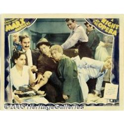 <B>A Night at the Opera (MGM, 1935)</B></I> Lobby Card (11" X 14"). This is THE scene card to have from this classic film! The three Marx Brothers are all present in this Stateroom card. The card has had the most minimal cleaning and pinholes filled in the border. It appears near mint. Very Fine.