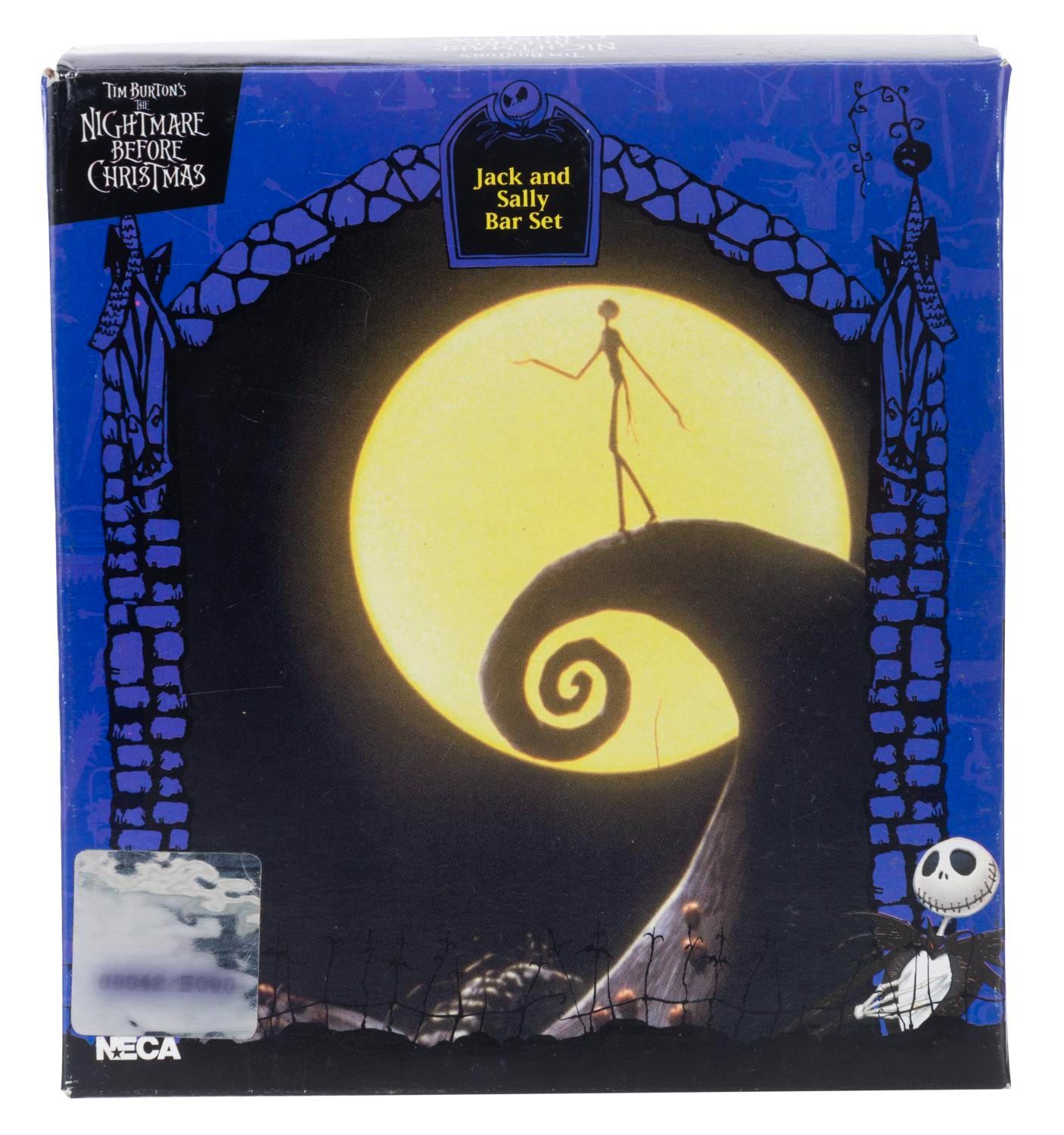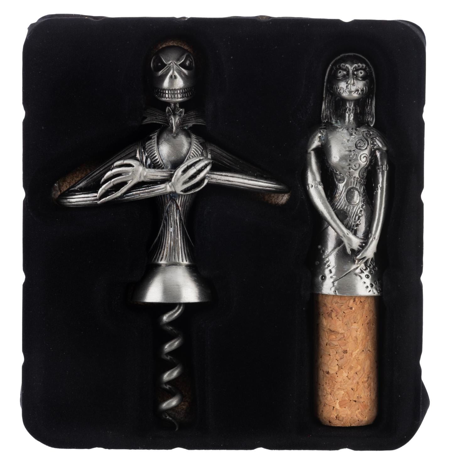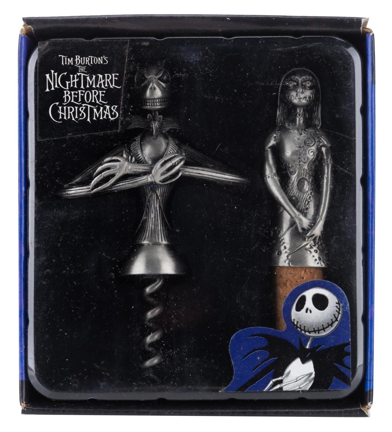 (NECA, 2000s) A"Nightmare Before Christmas" pewter bar set, including a Jack Skellington corkscrew and a Sally wine stopper. The set is in fine unused condition in the original box.