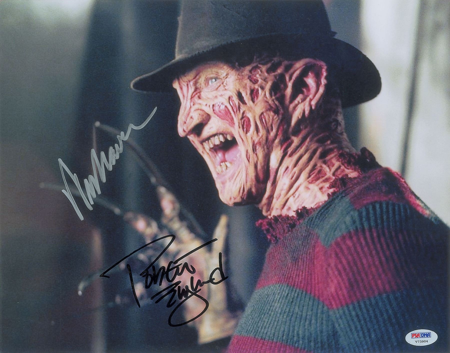 Color glossy 14 x 11 photo of burnt serial killer Freddy Krueger brandishing his bladed glove, signed in black felt tip by Robert Englund and in silver ink by the late Wes Craven. In fine condition, with a PSA/DNA label affixed to lower right corner. Accompanied by a certificate of authenticity from PSA/DNA.