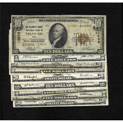 <B>A Nonet of Better Ohio Small Size Nationals.</B></I><BR>Delaware, OH - $10 1929 Ty. 2 The Delaware County NB Ch. # 13535 <B>Fine</B></I><BR>Fremont, OH - $5 1929 Ty. 1 The First NB Ch. #5 <B>Extremely Fine</B></I><BR>Lima, OH - $20 1929 Ty. 2 Ch. # 13767 <B>Fine</B></I><BR>Lynchburg, OH - $5 Ty. 1 The First NB Ch. # 11772 <B>Extremely Fine</B></I> with tape residue<BR>New Holland, OH - $20 1929 Ty. 2 The First NB Ch. # 7187 <B>Extremely Fine</B></I><BR>Ottawa, OH - $10 1929 Ty. 1 The First NB Ch. # 7006 <B>Very Fine</B></I> with stains<BR>Tippecanoe City, OH - $5 1929 Ty. 2 The Tipp NB Ch. # 3004 <B>Very Fine</B></I><BR>Youngstown, OH - $5 1929 Ty. 1 The Second NB Ch # 12332 <B>Very Fine</B></I><BR>Youngstown, OH - $20 1929 Ty. 2 The Union NB Ch # 13586 <B>Very Fine</B></I>.