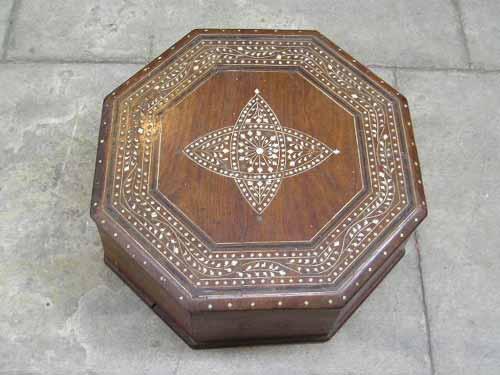A North African inlaid hardwood octagonal box, an oak collector's chest (a.f.) and hat stretcher....