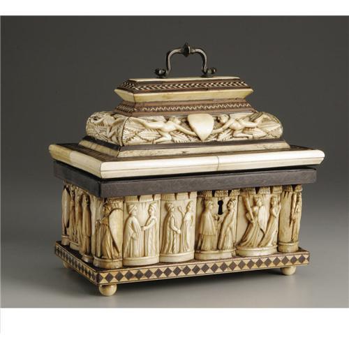 <B>An Italian Carved Bone and Wood Marriage Casket</B></I><BR><BR>Embriachi Workshop, possibly Florence, Italy<BR>Fifteenth Century<BR>Bone and wood<BR>Unmarked<BR>6.5 in. x 7.25 in. x 4.5 in.<BR><BR>An Italian carved bone and wood marriage casket, each panel of the body carved with figures, surmounted by a shaped lid with angels flanking cartouches<BR>Provenance: Christie's France, 15 May 20031 <BR><BR><B>Condition Report:</B> Condition: wear commensurate with age, key missing
