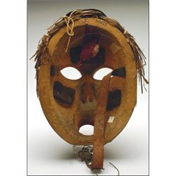 A Northwest Coast Nootka carved and painted wood mask, with cedar bark attachment, 14" - 35.6 cm.
