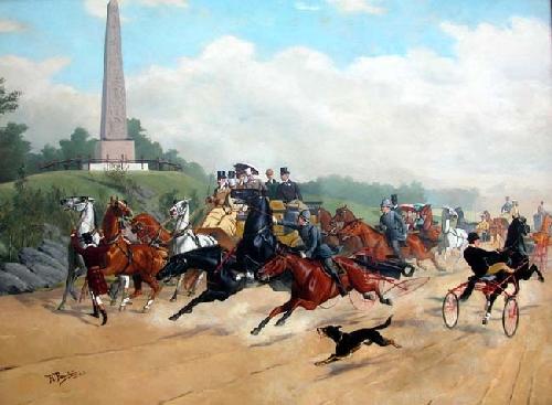 A OIL ON CANVAS OF A COACHING SCENE BY R. ROSENBAUM; 1894; Signed ll, 54" x 72"