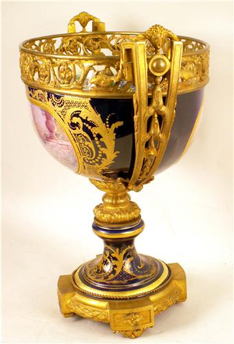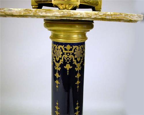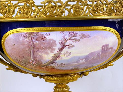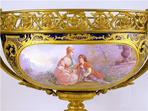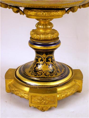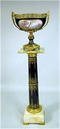 possibly Sevres. One reserve bears signature E. Carelle. Some chips, crazing, and hairlines. Together with a similarly decorated alabaster and porcelain columnar pedestal. 2 pieces, Overall: 5`4"h Pedestal: 43"h x 13 3/4"w x 13 1/4"d Compote: 20"h x 20"w