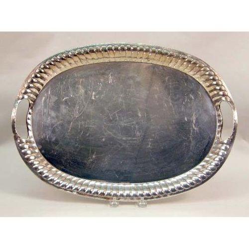 A OVAL MEXICAN STERLING SILVER FOOTED AND DOUBLE-HANDLED SERVING TRAY<BR><BR>With fluted border, the underside stamped "Tave ME-32, Mexico 925" total 43 oz. Scratches, wear to serving surface. 18"l x 13"w