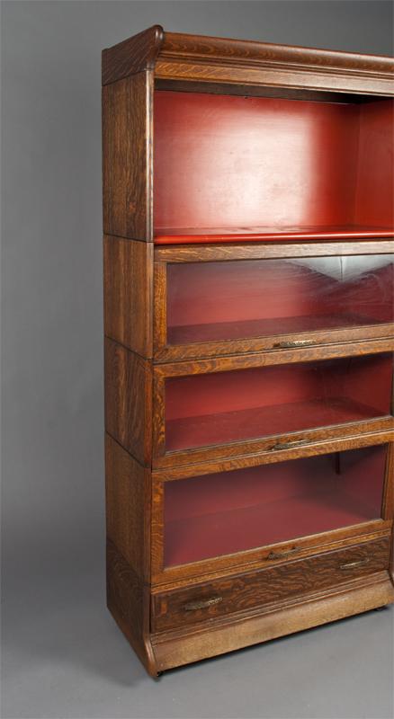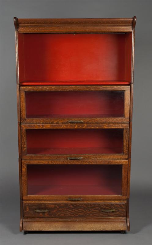 An oak barrister bookcase with four sections and single drawer on bottom, stamped brass pulls, lacking one lift glass door, sides with drilled holes; can be filled. 65.5 H x 34.25" W x 14.25" D, shelf depth 10.25". Circa 1900.