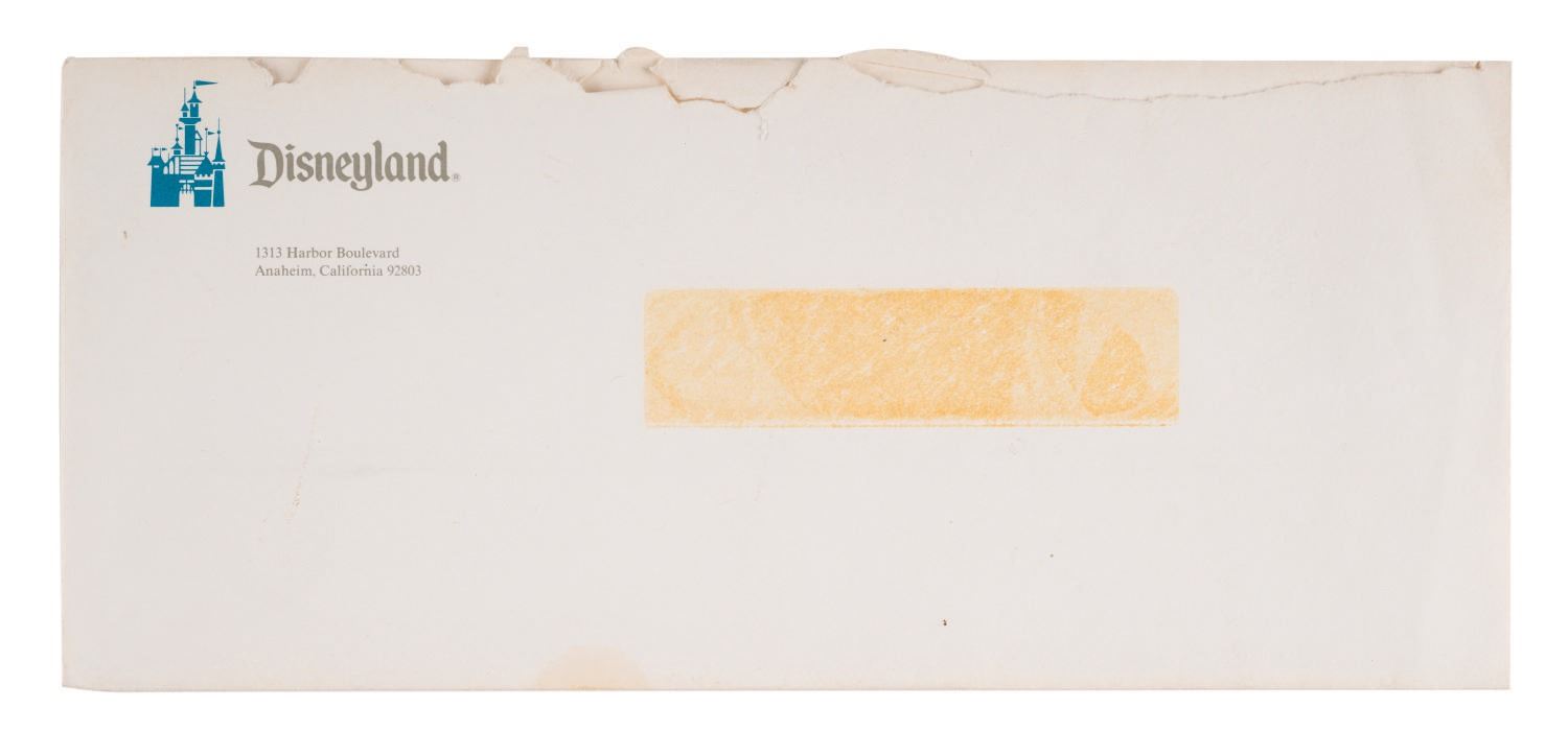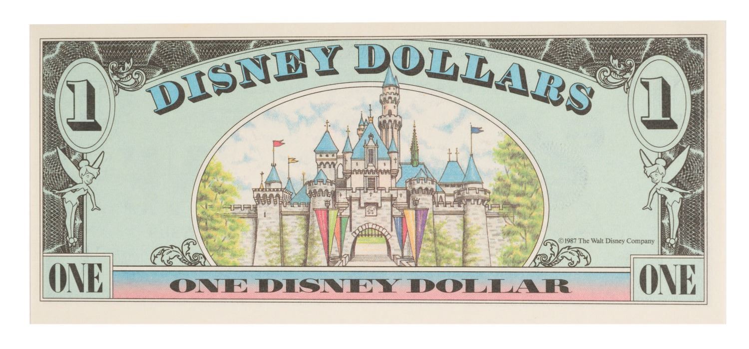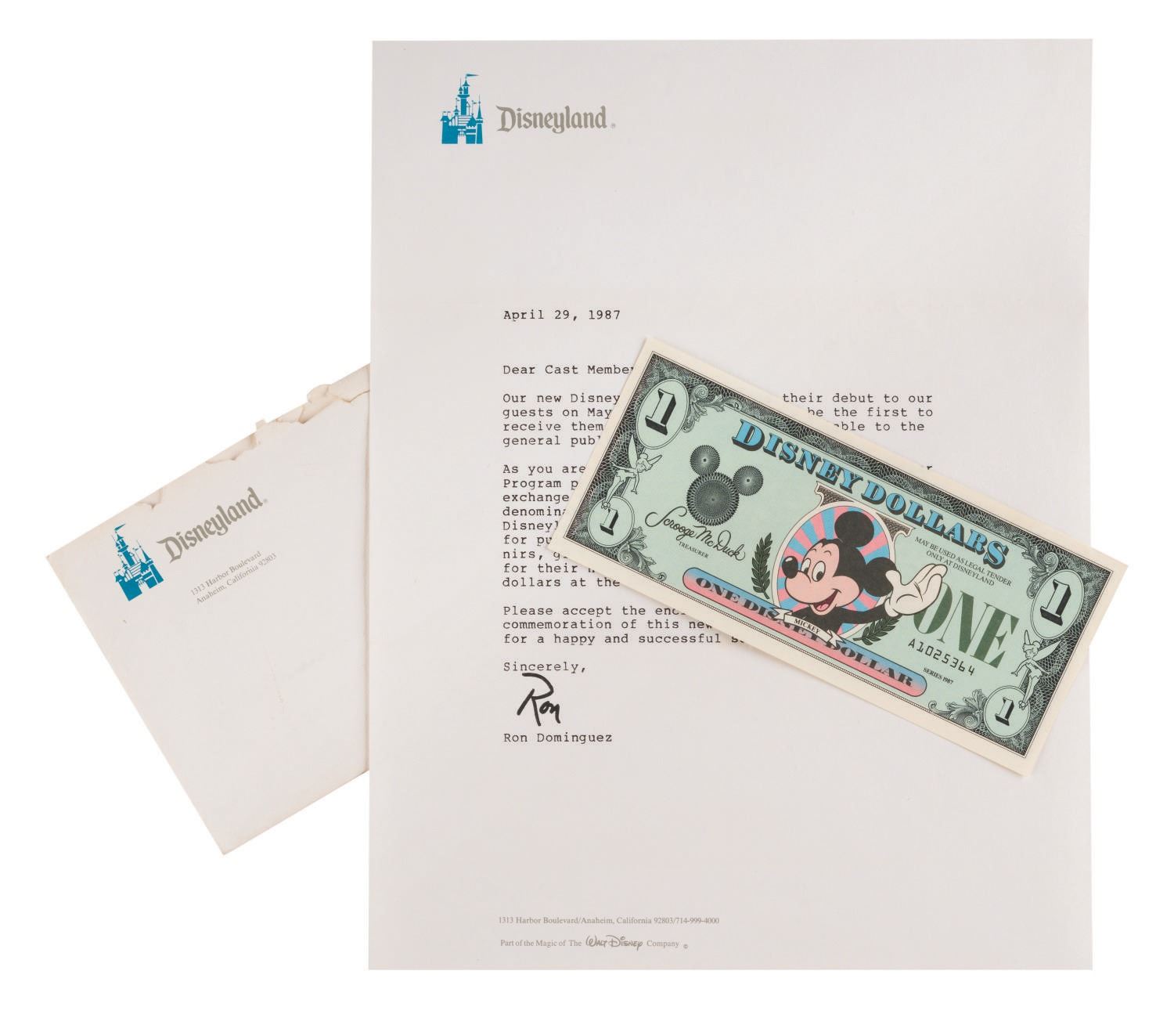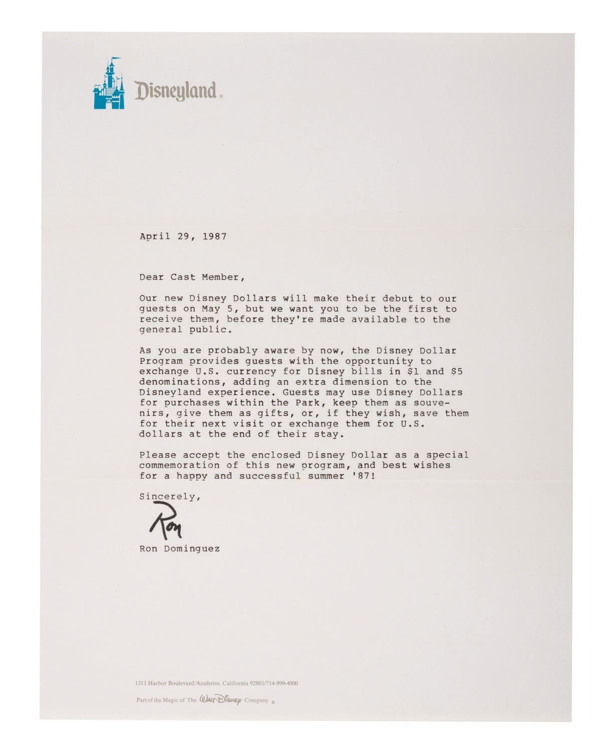 (Disneyland, 1987) A One Disney Dollar bill accompanied by a rare commemorative letter from Ron Dominguez for Cast Members, which introduces the new in-Park currency. The bill measures 6.25"x2.75" while the letter is 8.5"x11", each piece in fine condition with light wear.
