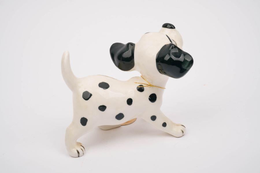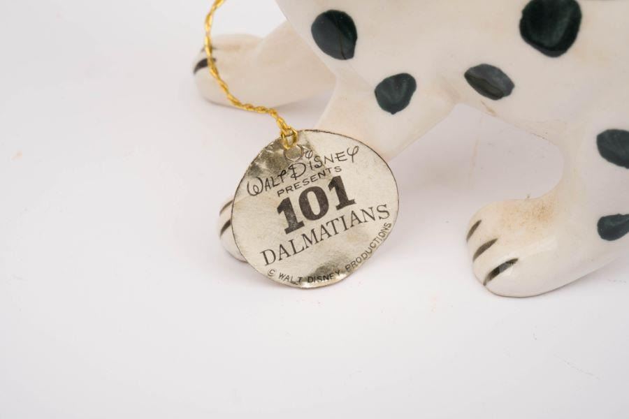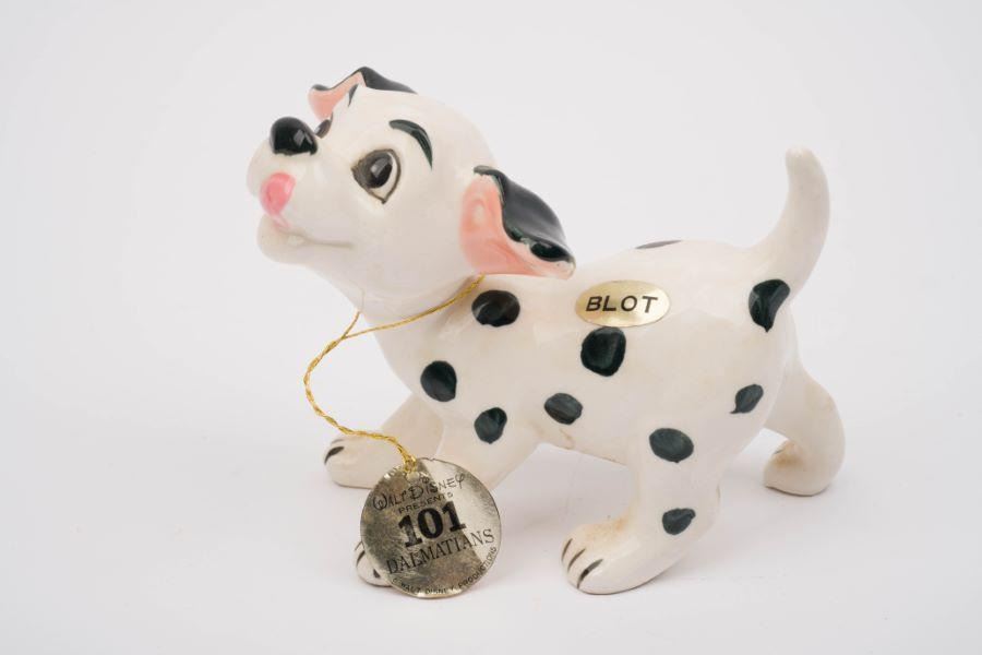 (Enesco, 1960s-70s) A ceramic figurine of the puppy Blot from "One Hundred and One Dalmatians." Figurines like this were produced by Enesco and sold as souvenirs at Disneyland during the 1960s. Measuring 4.25" x 2.5" and 4" tall, the figurine is in very good condition with the original tag.