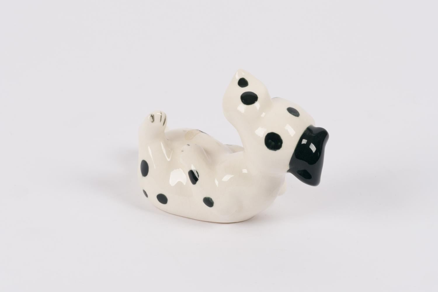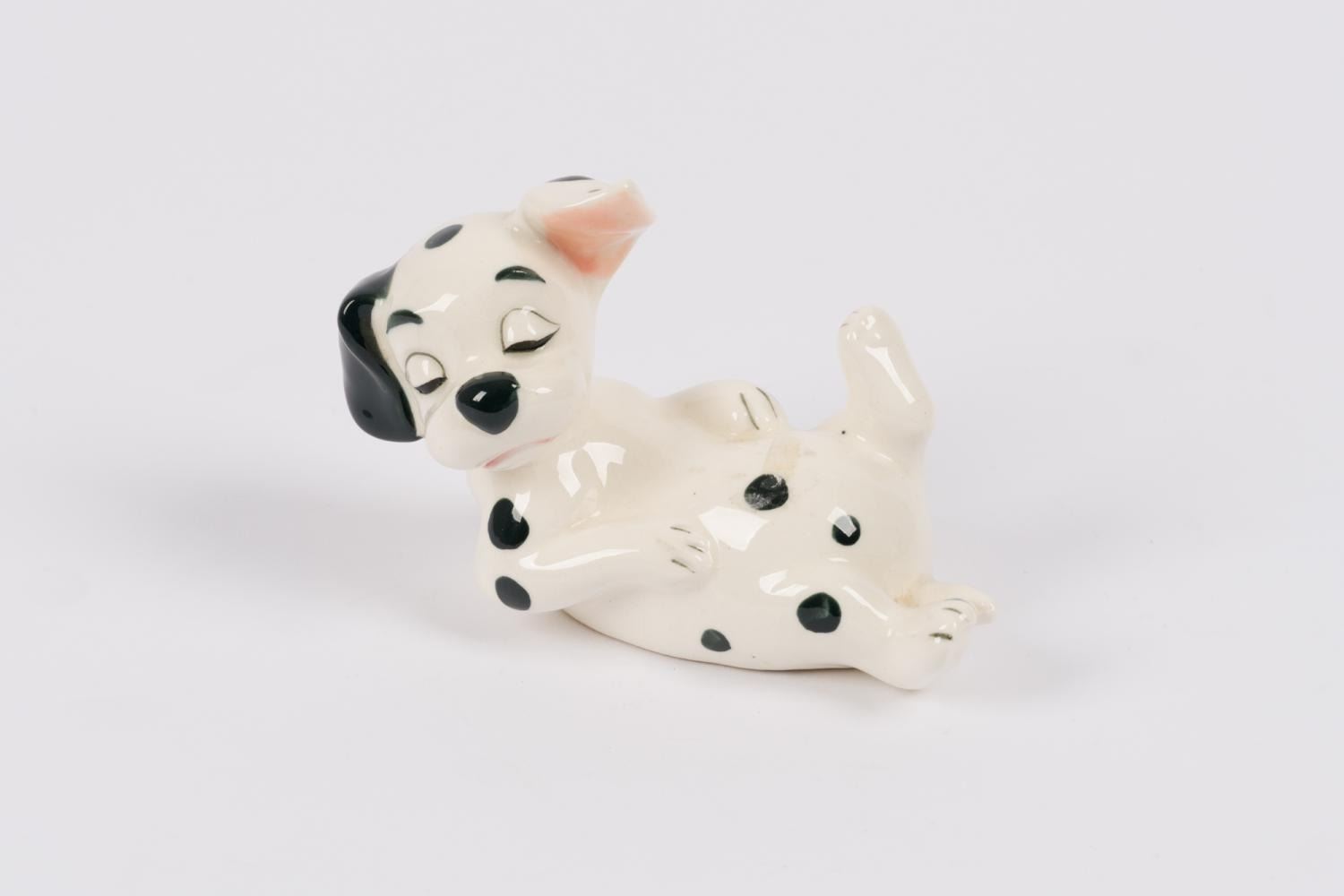 (Enesco, 1960s-70s) A ceramic figurine of Jolly, one of the puppies from "One Hundred and One Dalmatians." Measuring 5" x 2.25" and 3.5" tall, the figurine is in good condition with crazing throughout, and a spot of discoloration on his belly.