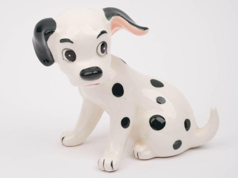 (Enesco, 1960s-70s) A ceramic figurine of the puppy Lenny from "One Hundred and One Dalmatians." Measuring 5" x 2.5" and 4" tall, the figurine is in good condition with significant crazing throughout.