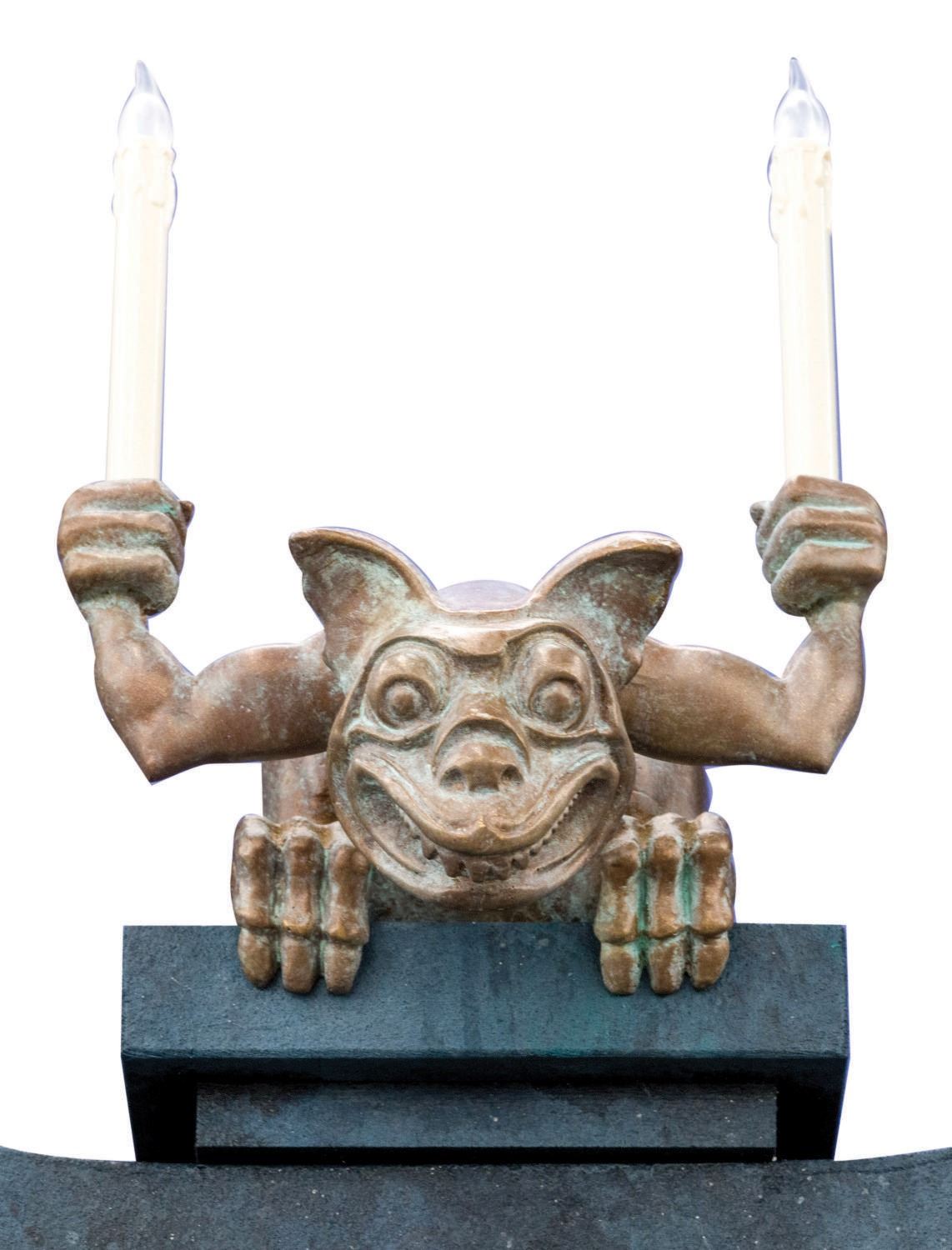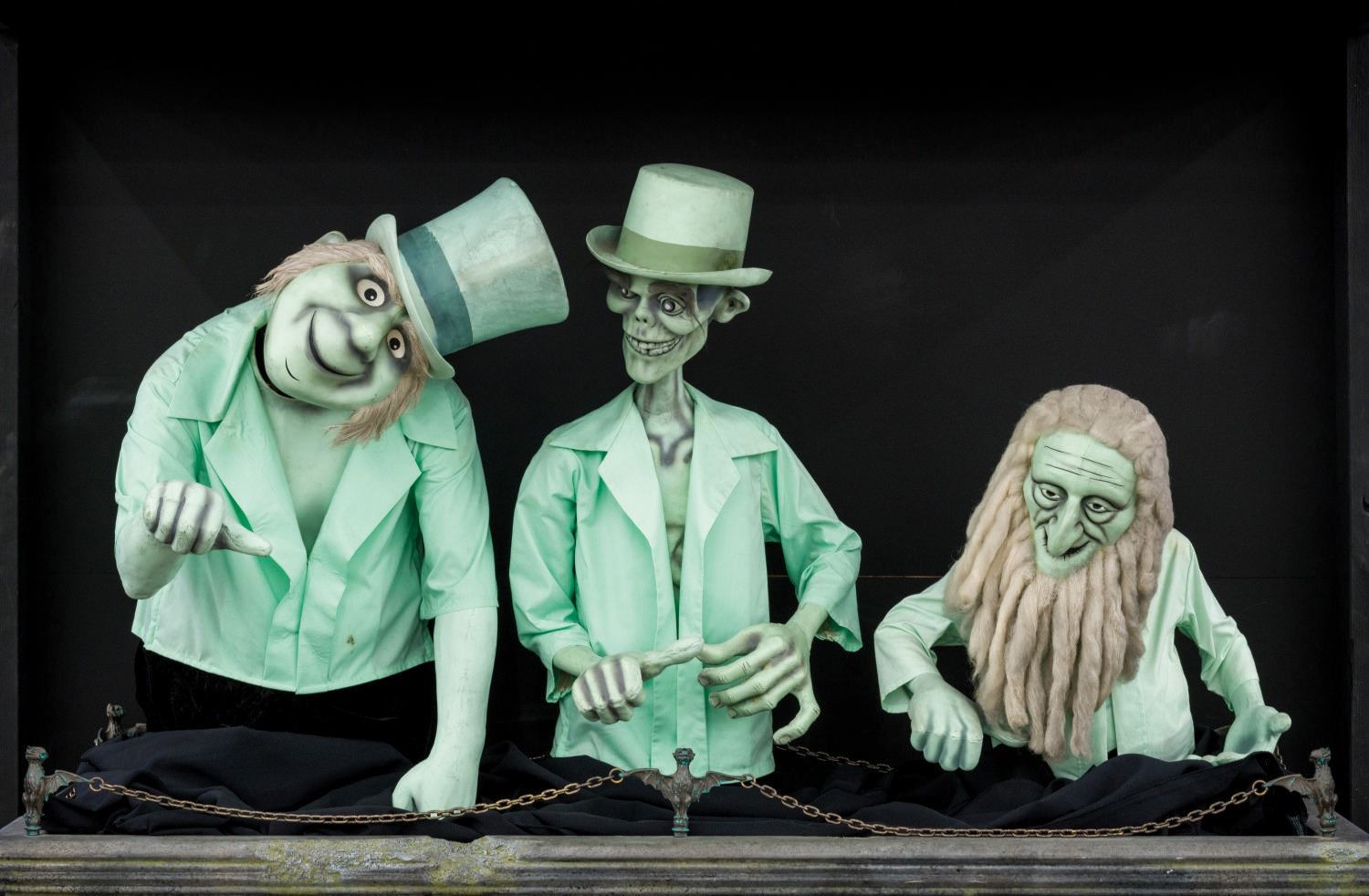 (Walt Disney World, 1971) An Incredible display featuring three of the original Hitchhiking Ghosts from the Haunted Mansion at Walt Disney World. These Ghosts appeared inside the guests' Doombuggy at the end of the ride to "follow you home." Originally each individual ghost sat on a track and moved in tandem with the Doombuggy behind the mirrors. In 2010, all the figural mirror ghosts were removed from the attraction and replaced with a video image. These three ghosts were retained and sold at the 2011 D23 Convention Auction. The ghosts were then mounted in this custom display. When activated, the ghosts move their heads and arms as "Grim Grinning Ghosts" plays. Phineas, Ezra, and Gus each measure between 22" and 33" high, and are in very good Park-used condition. The custom display measures 70.5"x28.5"x84.5" high, displaying in very good condition, with intentional distress and some slight wear to front corners. This is the Ultimate piece of Haunted Mansion memorabilia, and the only three Hitchhiking Ghosts know to have been sold by Disney. Due to size, special shipping arrangements are required. Please inquire before bidding.