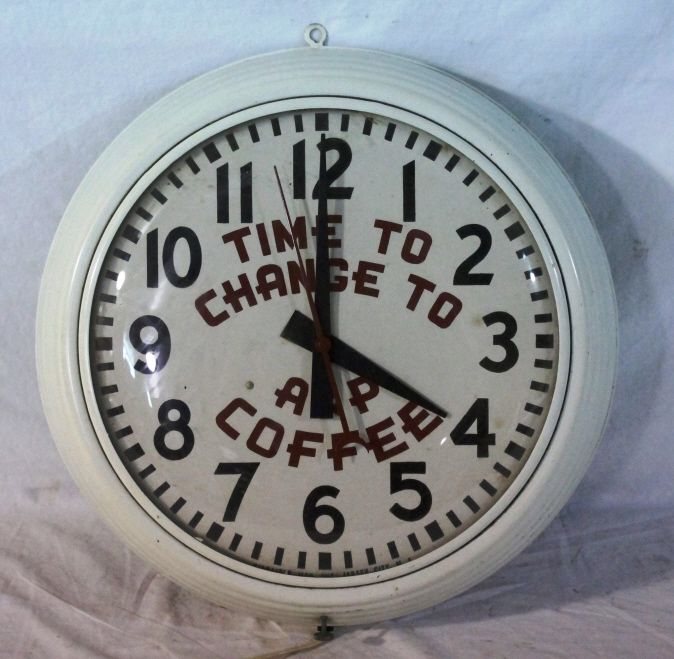 "Time to change to A&P Coffee". 15 1/2" diameter. Works