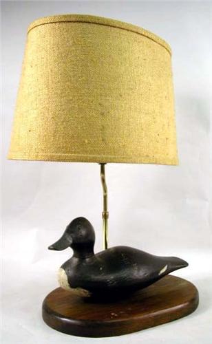 A PAINT-DECORATED BLUE BILL HEN DECOY; Now mounted as a lamp 25"h x 14"l