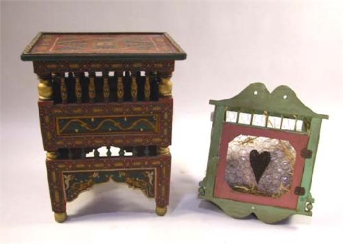 A PAINT-DECORATED TRAY-TOP LOW TABLE; With spindle-inset side and ball feet, Together with a green-painted wire hanging cabinet (2 pieces) 24"h x 18"w x 14"d
