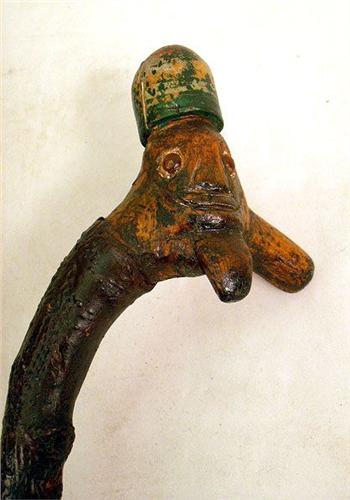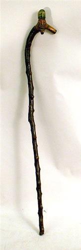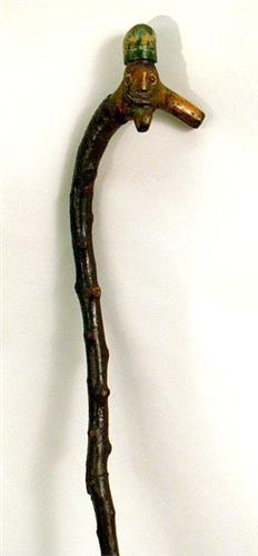 Depicting a man`s face with inset beaded eyes, retains original bark. Wear to surface. 34"l.