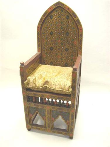 A PAINTED AND POLYCHROME-DECORATED LANCET ARCHED MOROCCAN STYLE ARMCHAIR; incised decoration with stars and interlocking devices, above a spindled apron and bracketed base.