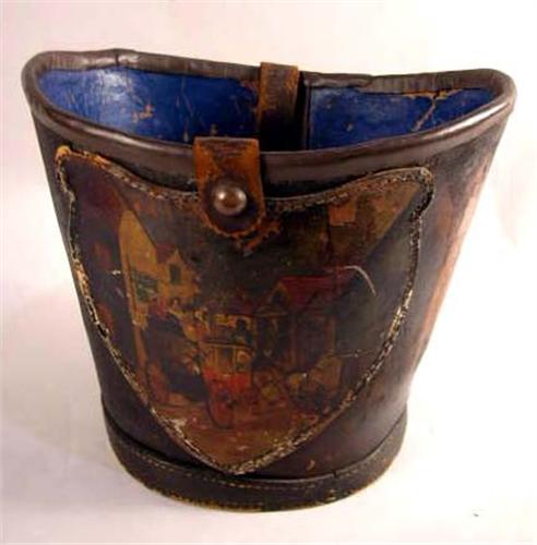 A PAINTED AND POLYCHROME-DECORATED LEATHER FIRE BUCKET; Depicting a coaching scene within a town, (losses, repairs and wear throughout) 12 1/2"h