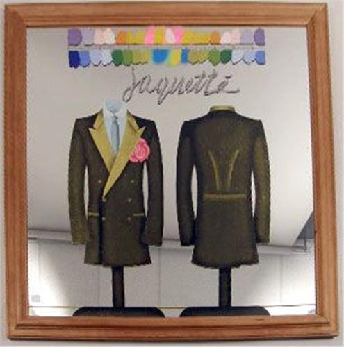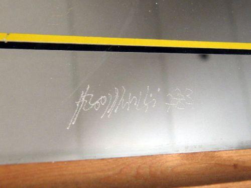 <B>A PAINTED AND POLYCHROME-DECORATED MIRROR</B><BR><BR>Titled "Jacquette", possibly signed Polini `73. 47"h x 47"w