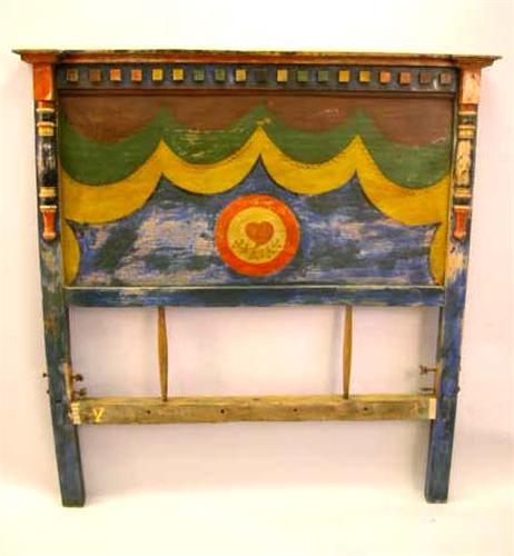 A PAINTED AND POLYCHROME-DECORATED PINE BEDSTEAD; with dentil-molding, 4'5"h x 4'2"w x 6'10"l.
