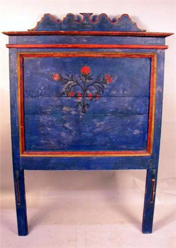 A PAINTED AND POLYCHROME-DECORATED PINE BEDSTEAD; comprising a paneled head board ending in scrolled finials and tapered feet, 5'6"h x 43"w x 6'9"l.