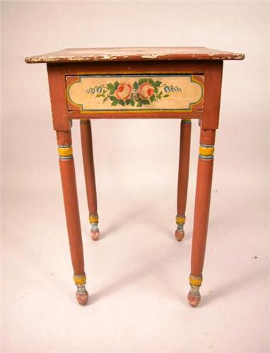 A PAINTED AND POLYCHROME-DECORATED POPLAR ONE-DRAWER STAND; American, on turned legs and ball feet, wear, 28 1/2"h x 18"w x 17 1/2"d