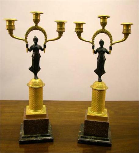 A PAIR LOUIS XVI STYLE THREE-LIGHT ORMOLU CANDELABRA; with figural supports holding the candle arms on stone bases. losses. 19 1/2"h
