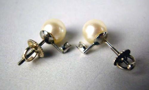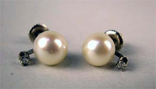 A PAIR OF 14K WHITE GOLD AND CULTURED PEARL EARRINGS Each set with a circular diamond, pearls apx. 7.50 mm