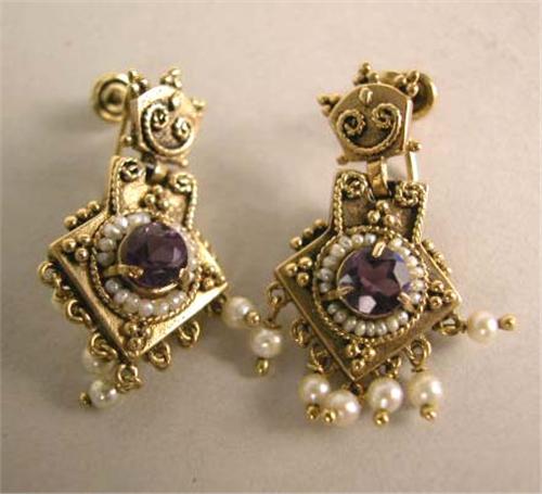 A PAIR OF 14K YELLOW GOLD, AMETHYST AND PEARL EARRINGS
