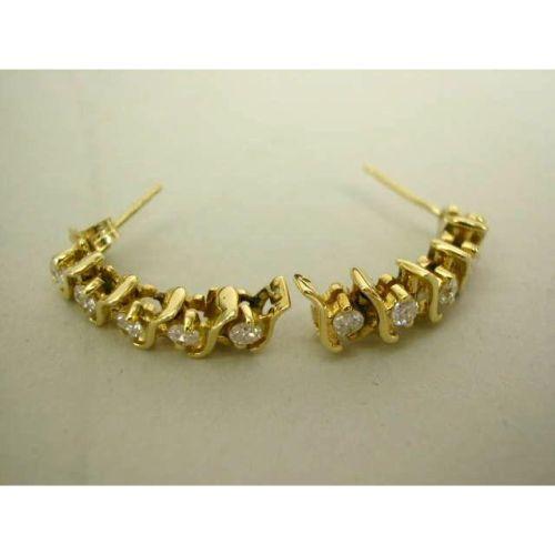 A PAIR OF 14K YELLOW GOLD AND DIAMOND EARRINGS<BR><BR>Each set with five prong set bar spaced round diamonds, each apx. .07 carats, curved measuring 3/4"l x 3/16"w