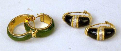 Set with small diamonds, stamped 585, fitted for clip and pierced ears. Together with a pair of 14K yellow gold and jadeite stone earrings. Weight approximately 5 dwt. 4 pieces.