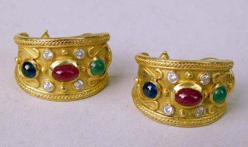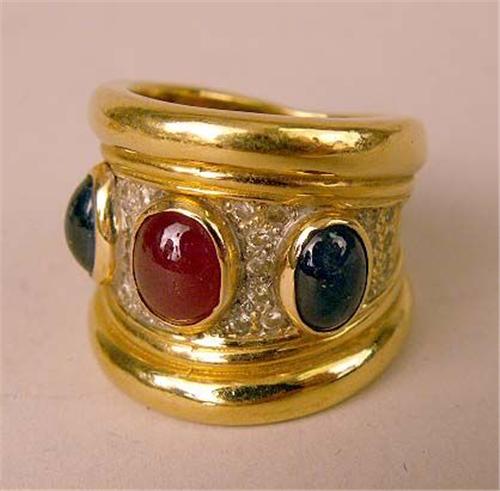 Demi-lune form set with cabochon rubies, emeralds, and sapphires and four small round cut diamonds on each side, stamped 14kt C.K. Weight 10.4 dwt. Together with a sterling silver gilt lady`s ring, set with cabochon red stones flanked by two sapphires
