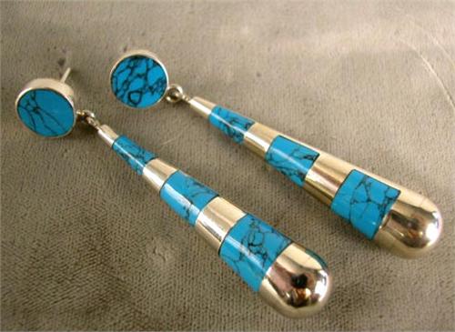 A PAIR OF 950 MEXICAN SILVER AND TURQUOISE INLAY EARRINGS;