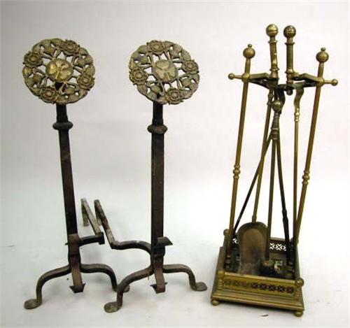 A PAIR OF ARTS AND CRAFTS CAST BRASS AND WROUGHT IRON ANDIRONS; Together with a set of arts and crafts brass fire tools and stand, the andirons are baroque in appearance with thistle and clover decorated heads, the tools of typical form with a stand containing an artistic tile base Andirons: 29 1/2"h x 12"w x 22"d