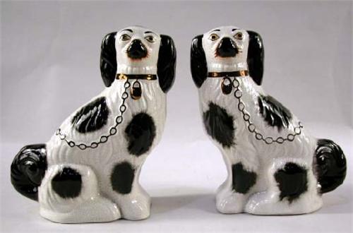 A PAIR OF BLACK AND IVORY STAFFORDSHIRE DOGS; 9"h