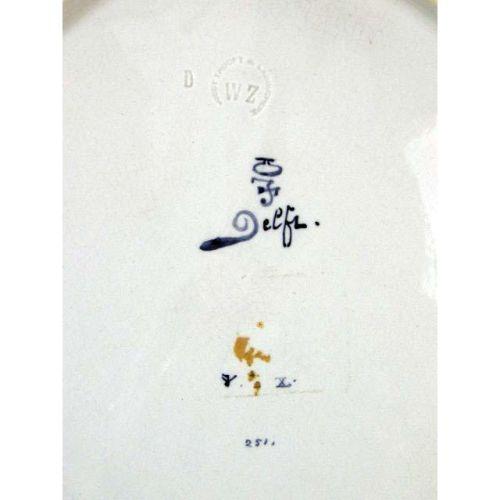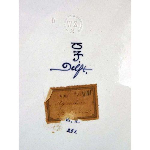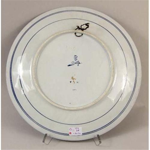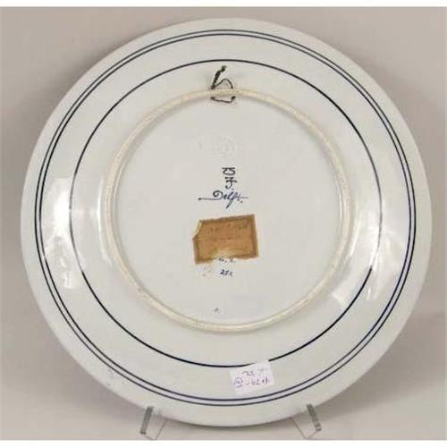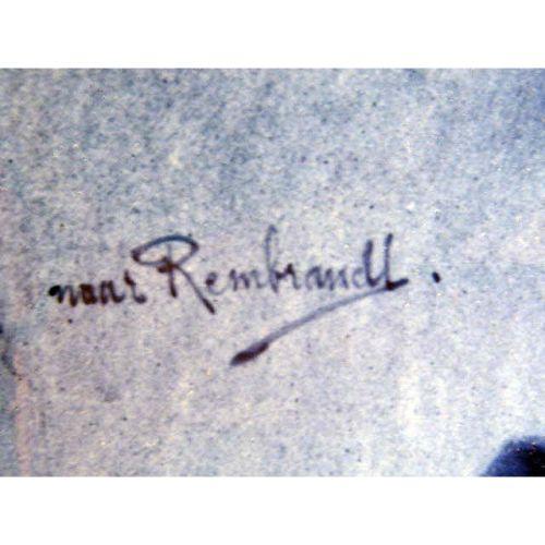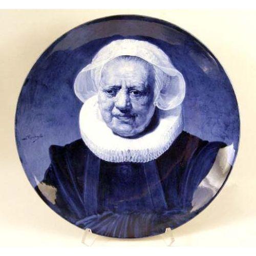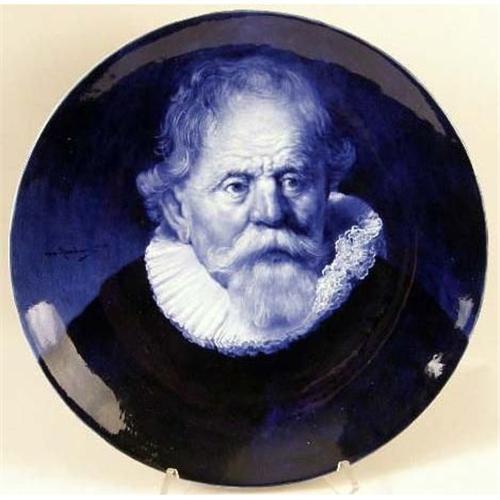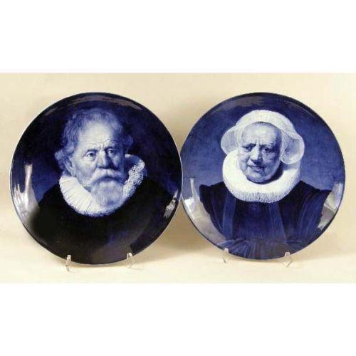 A PAIR OF BLUE AND WHITE DELFT CONVEX CIRCULAR PLATTERS<BR><BR>Depicting a gentleman and lady in ruffled collars, both bear signature "Naar Rembrandt," impressed verso "Woost Thoout and Labouchere," losses and crazing, 16"dia. 2 pieces