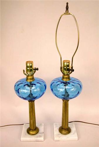 A PAIR OF BLUE, BRASS AND MARBLE SANDWICH STYLE LAMPS