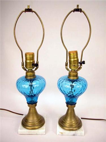 A PAIR OF BLUE SANDWICH GLASS TABLE LAMPS WITH BRASS AND MARBLE BASE;