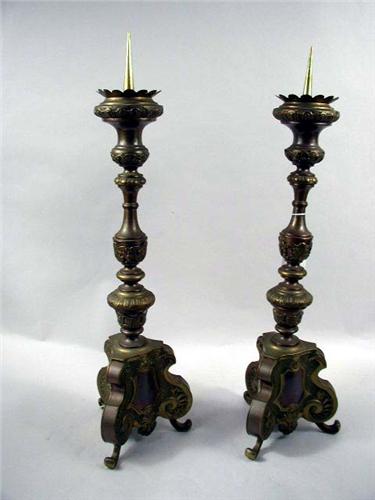 A PAIR OF BRASS BAROQUE STYLE PRICKET CANDLESTICKS; Leaf embossed standard on triangular footed base, 27"h