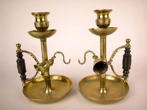 A PAIR OF BRASS CHAMBERSTICKS, ENGLISH; Together with wooden handles and matching snuffers 7 1/2"h