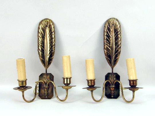 A PAIR OF BRASS FEATHER-MOTIF TWO-LIGHT WALL SCONCES