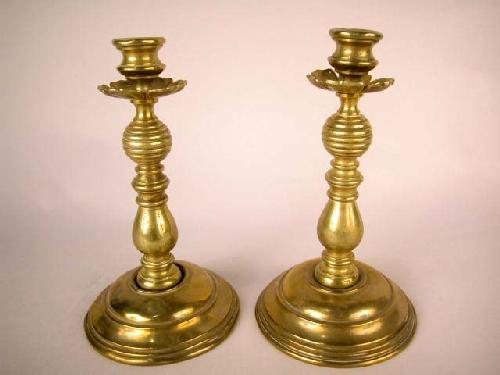 A PAIR OF BRASS ROUND BASE CANDLESTICKS; 8"h