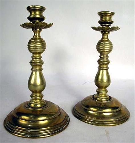A PAIR OF BRASS ROUND BASE CANDLESTICKS; 8"h