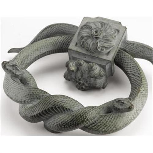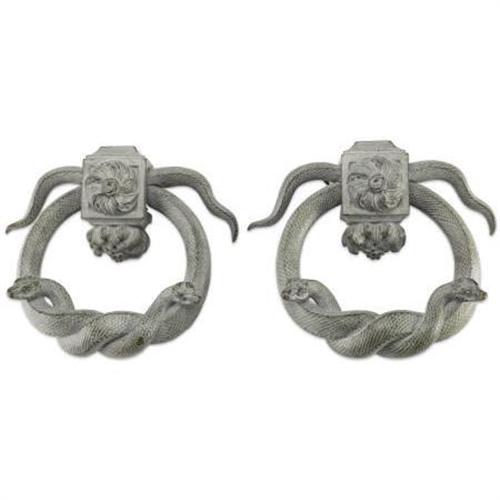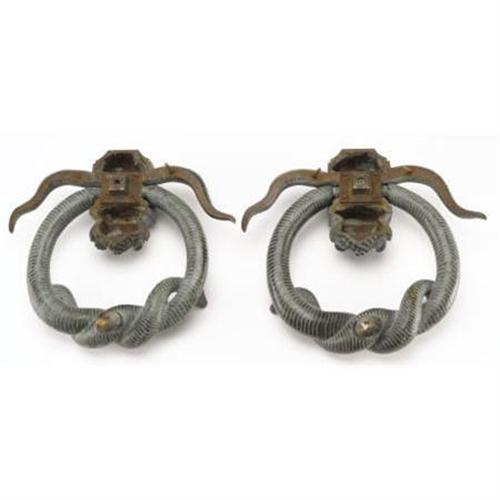 <B>A Pair of Bronze Door Knockers<BR><BR></B></I>Unknown maker, Continental<BR>19th century<BR>Bronze<BR>Unmarked<BR>9.45 inches high x 8.50 inches wide <BR> These two elaborate door knockers are made of heavy bronze and feature two intertwined snakes forming the knocker ring. With a rosette fashioning the uppermost part of the knockers at the point of attachment, they are very attractive and date to the 19th century. They exhibit a coarse greenish patina and are in overall excellent condition.<BR><BR>Provenance:<BR>Christie's, London (1978)<BR><BR><BR><b>Shipping:</b> Requires 3rd Party Shipping (<a target="_blank" href="http://www.heritageauctions.com/common/shipping.php">view shipping information</a>)