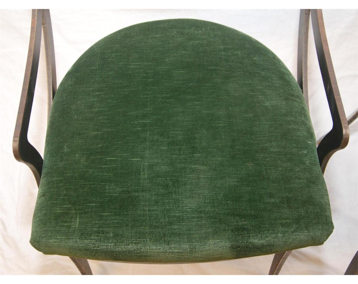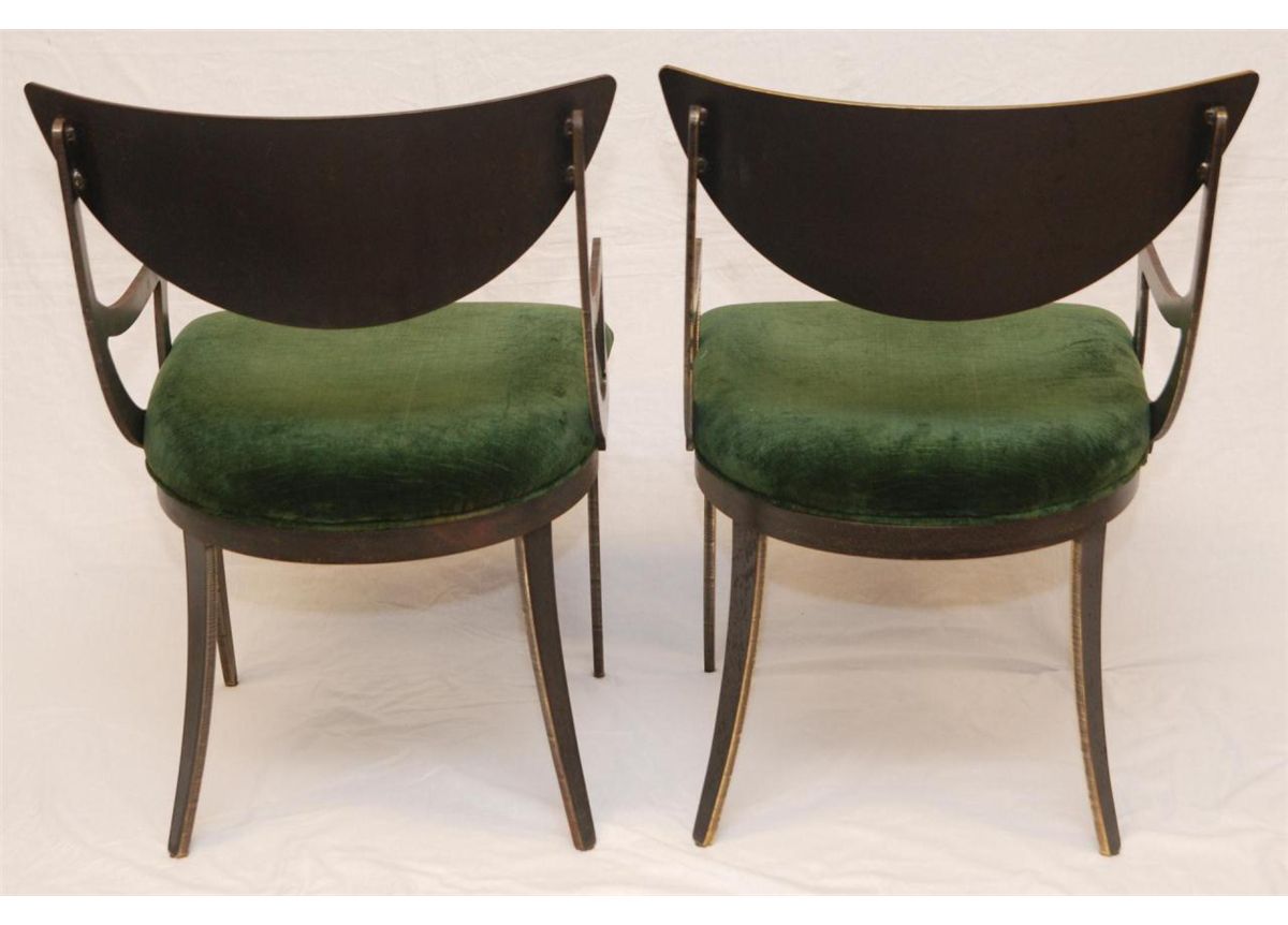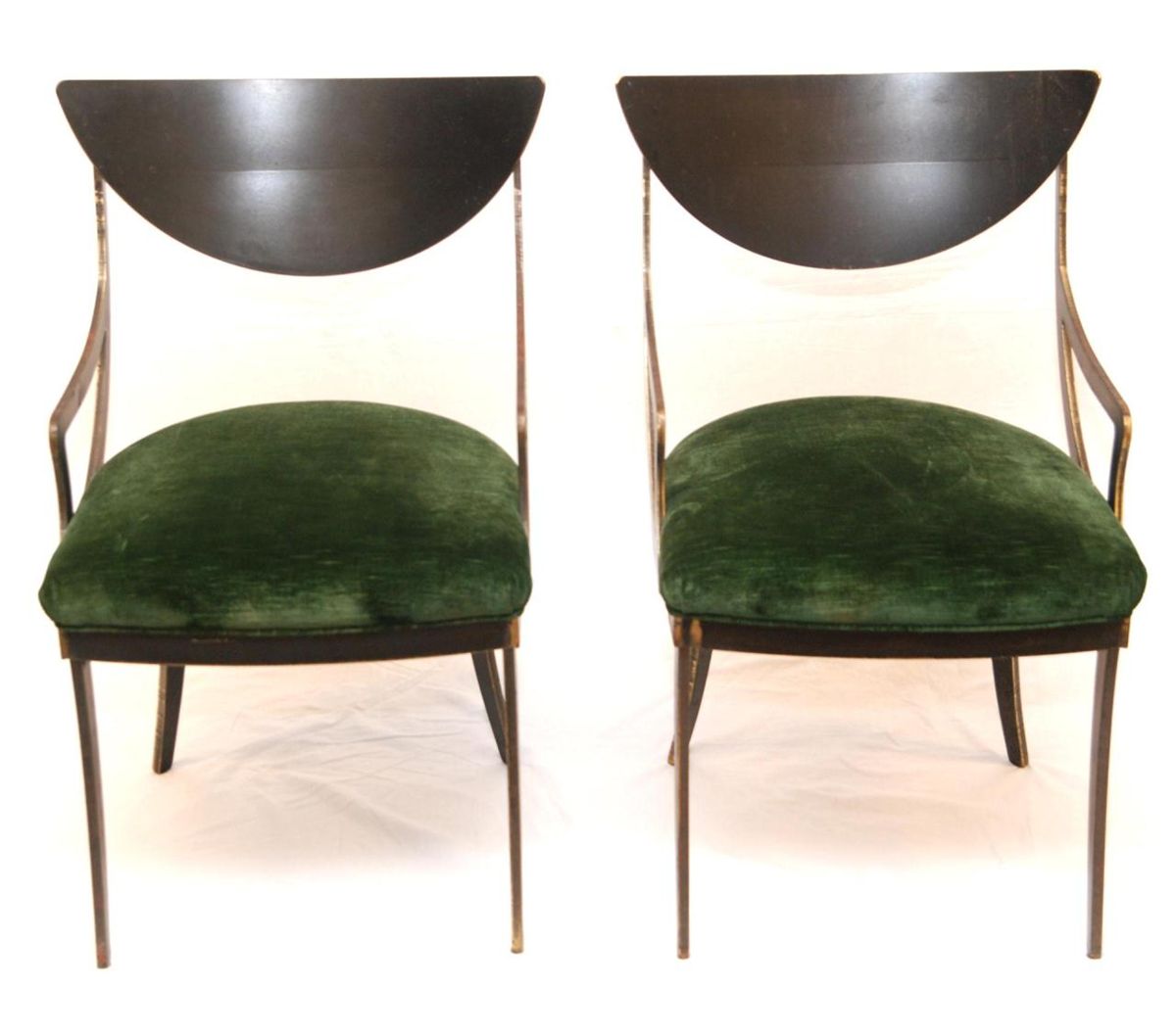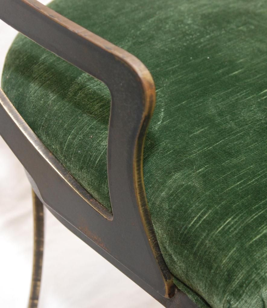 A pair of heavy bronze Robert Allen upholstered side chairs. Each having green upholstery. Black patina. Each measures 34" height x 22" width x 23" depth (86.3cm x 55.8cm x 58.4cm).