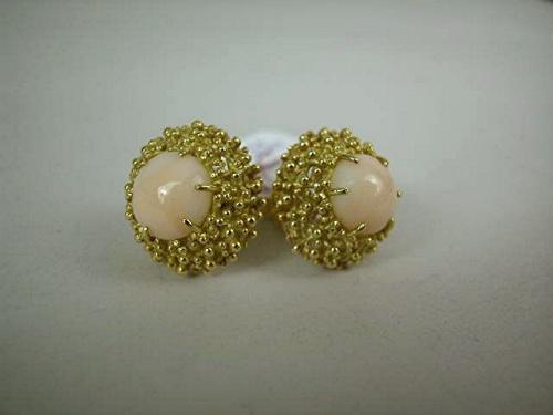 A PAIR OF CABOCHON CORAL AND YELLOW GOLD EARRINGS, fitted for pierced ears, 1/2"dia.