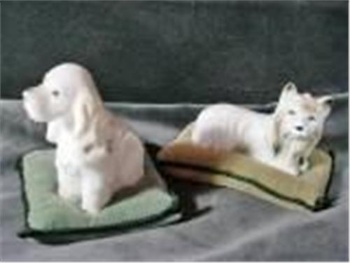 A PAIR OF CANINE PIN CUSHIONS WITH SMALL TERRIER DOGS SITTING ATOP GREEN VELVET PILLOWS. 3" HIGH