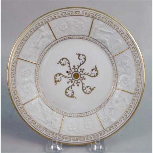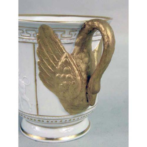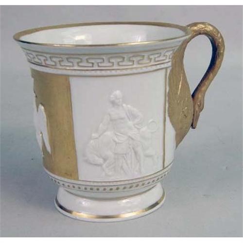 A PAIR OF CAPO-DI-MONTE PORCELAIN CABINET CUPS AND SAUCERS<BR><BR>White with gilt rims, embossed Grecian mythological motif, gilt winged bird handles, underglaze mark, 3-3/4"h