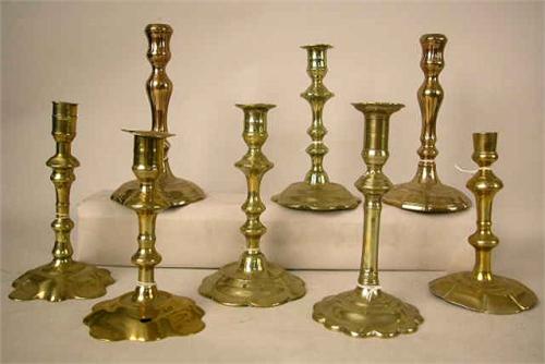 A PAIR OF CAST-BRASS AND A PAIR OF BELL-METAL PETAL-BASED CANDLESTICKS; probably English, together with four single examples, two missing cups, one missing a 1/2" chip of brass on base, one with split cup lip, otherwise average wear, 8 pieces, tallest 8 1/2" h